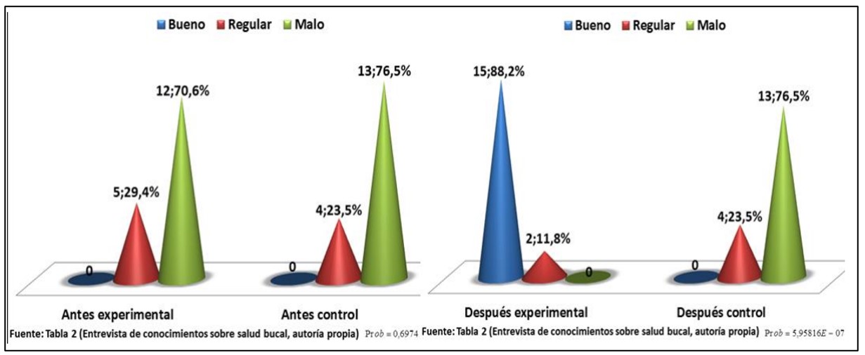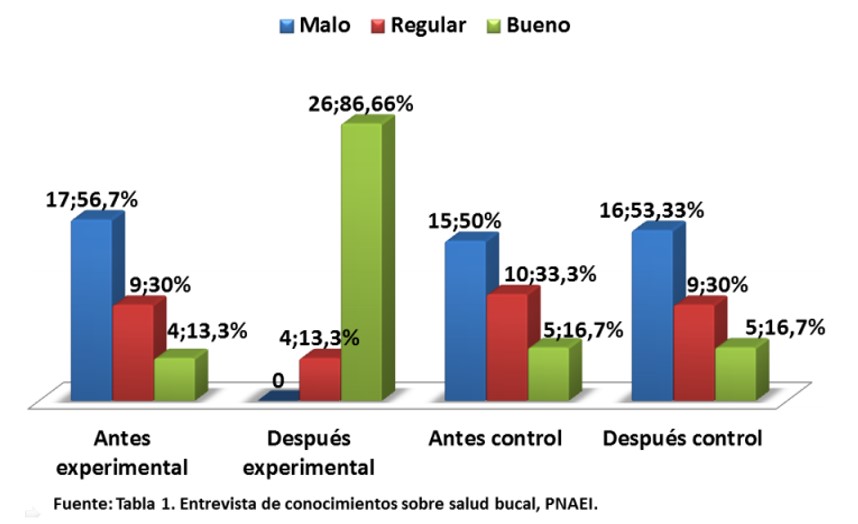 Similar results to the present investigation were reported in educational interventions conducted with a favorable effect on the level of knowledge about oral health in caregivers of minors in the Dr. Mario Muños Monroy University Polyclinic, Cuba(8), where knowledge improved from 54,7 % (poor before) to 84,37 % (good after); in Sancti Spíritus, Cuba(9), where insufficient knowledge was increased from 53,2 % to sufficient at 82,3 %; in Lima, Peru(10), medium knowledge was increased from 79,2 % to high in the 83,3 % of those intervened; in eight primary schools in the Huayrapata district, Department of Puno(11), where regular knowledge improved from 65,62 % (before) to 87,5 % (good knowledge, after).