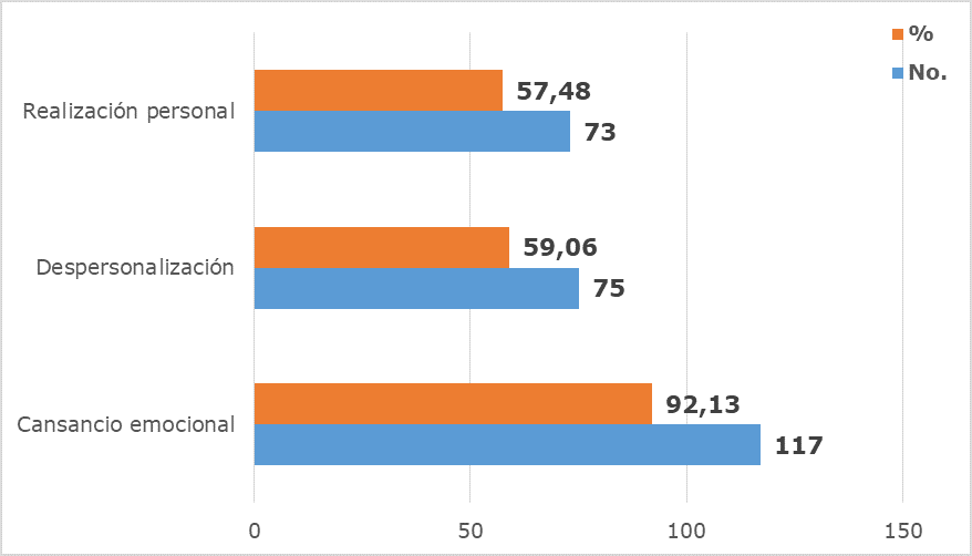 Results: 66,9 % of the workers were women, with a median of 31 years of age. Resident physicians predominated (45,7 %), with a median of 8 years working in the sector. 73,2 % showed overload, with the emotional exhaustion dimension being the most affected. The presence of Burnout syndrome was associated with sleeping eight hours a day (p=0,016) and with satisfaction with economic income (p<0,001). The affectation of the emotional exhaustion dimension was statistically associated with sex, religion and sleeping eight hours a day (p<0,05). Depersonalization was associated with religion (p=0,001), sleeping eight hours a day (p=0,016), smoking (p=0,001) and satisfaction with economic income (p=0,011); while professional achievement was related to sleeping eight hours a day (p<0,001), adequate dietary habits (p=0,038) and satisfaction with economic income (p=0,016).
